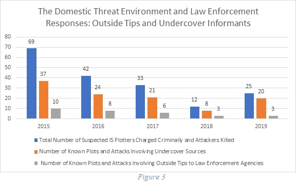 The arrest data illustrate how law enforcement aggressively utilized human sources to try to monitor and disrupt potential plots involving IS-related extremists. The data show that undercover sources were interacting with at least sixty-four percent of IS-related extremists arrested or killed between 2015 and 2019. Furthermore, the percentage of IS-related cases involving the use of undercover sources increased from a low of about fifty-four percent in 2015 to eighty percent of cases in 2019.