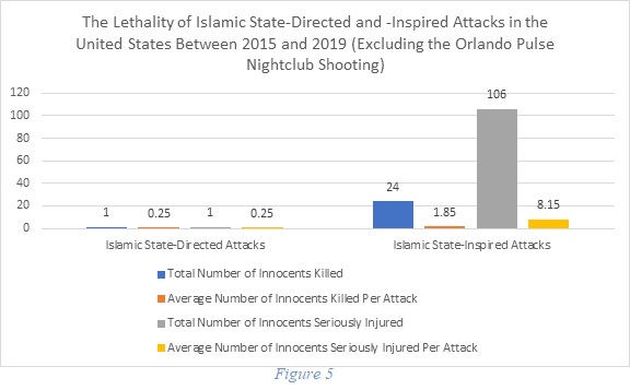 Although the attack statistics show that the average IS-inspired attacker killed and injured far more victims than IS-directed attackers in the United States, two incidents-deadly shootings in Orlando and San Bernardino-skewed the data on inspired attacks.[169] For instance, Omar Mateen’s IS-inspired attack on the Pulse Nightclub in Orlando, which resulted in forty-nine casualties, caused roughly 350% more casualties than the second deadliest inspired attack.[170] The Orlando attack accounts for nearly sixty-seven percent of the fatalities and thirty-three percent of the serious injuries that resulted from IS-inspired attacks during the five-year period. Furthermore, the two deadliest IS-inspired attacks, the shootings in Orlando, Florida and San Bernardino, California, were responsible for roughly eighty-six percent of the fatalities caused by IS-inspired attacks in the United States between 2015 and 2019.