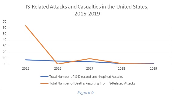 As Figure 6 illustrates, the number of IS-related attacks and fatalities in the United States declined from a peak of seven attacks that resulted in sixty-four fatalities in 2015 to one non-lethal attack in 2019.